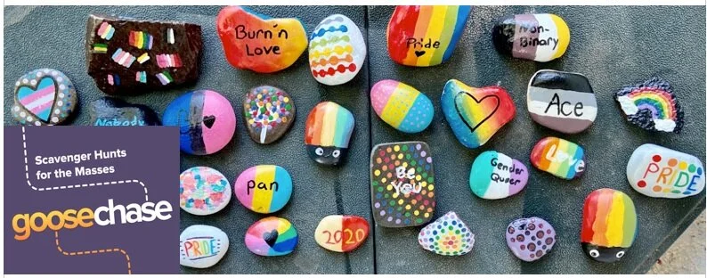 Download the free GooseChase app and look for the Pride Stone Parade game in the search bar - Open the game and start to ‘gather’ images of the stones you find to earn points and possibly win prizes.